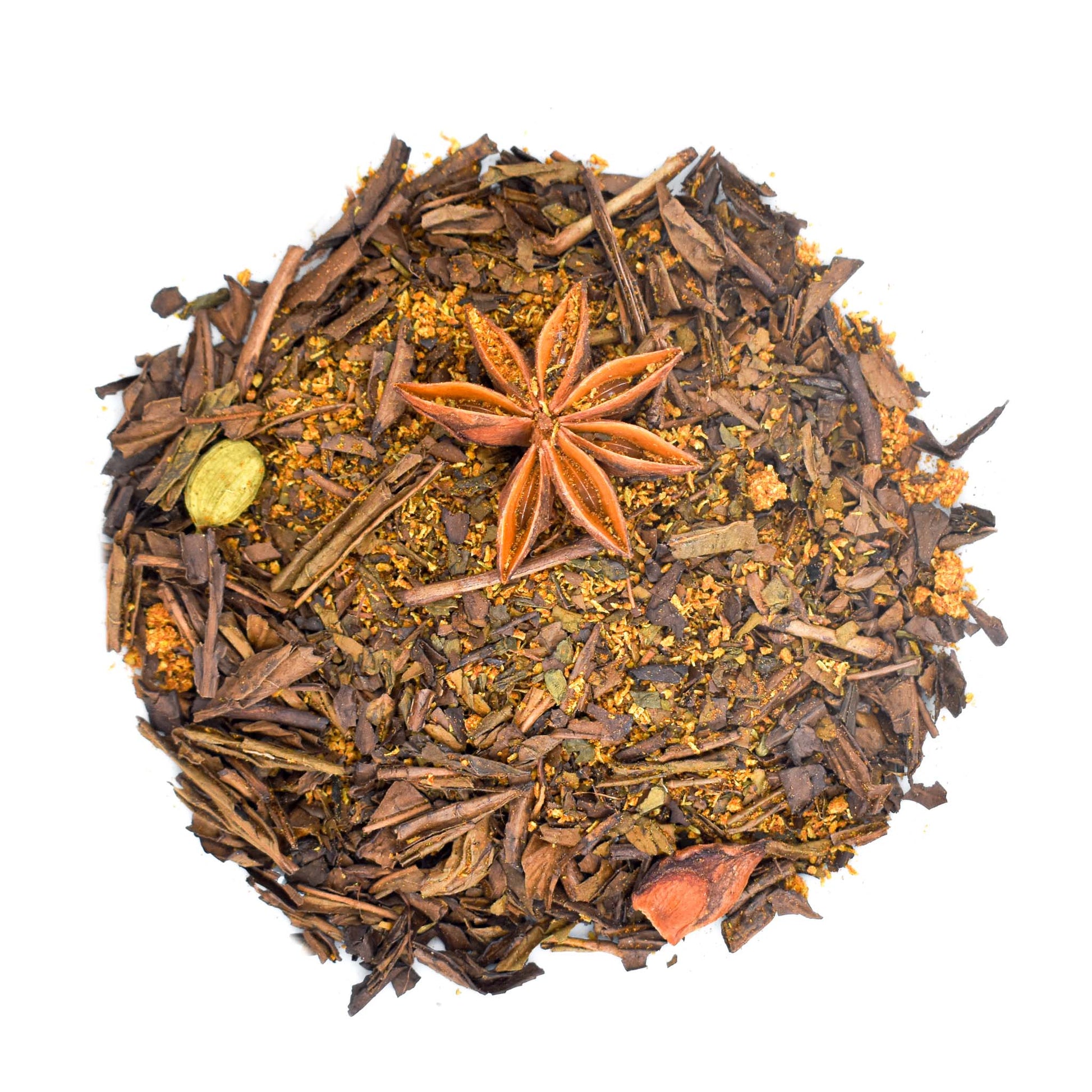 - Ingredients: Organic Roasted Green Tea (Kanaya, Shizuoka Prefecture, Japan), coconuts (Philippines), star anise (China), cinnamon powder (China, Vietnam), ginger powder (China), green cardamom (India), black pepper (Indonesia), tumeric powder (Okinawa Prefecture, Japan)