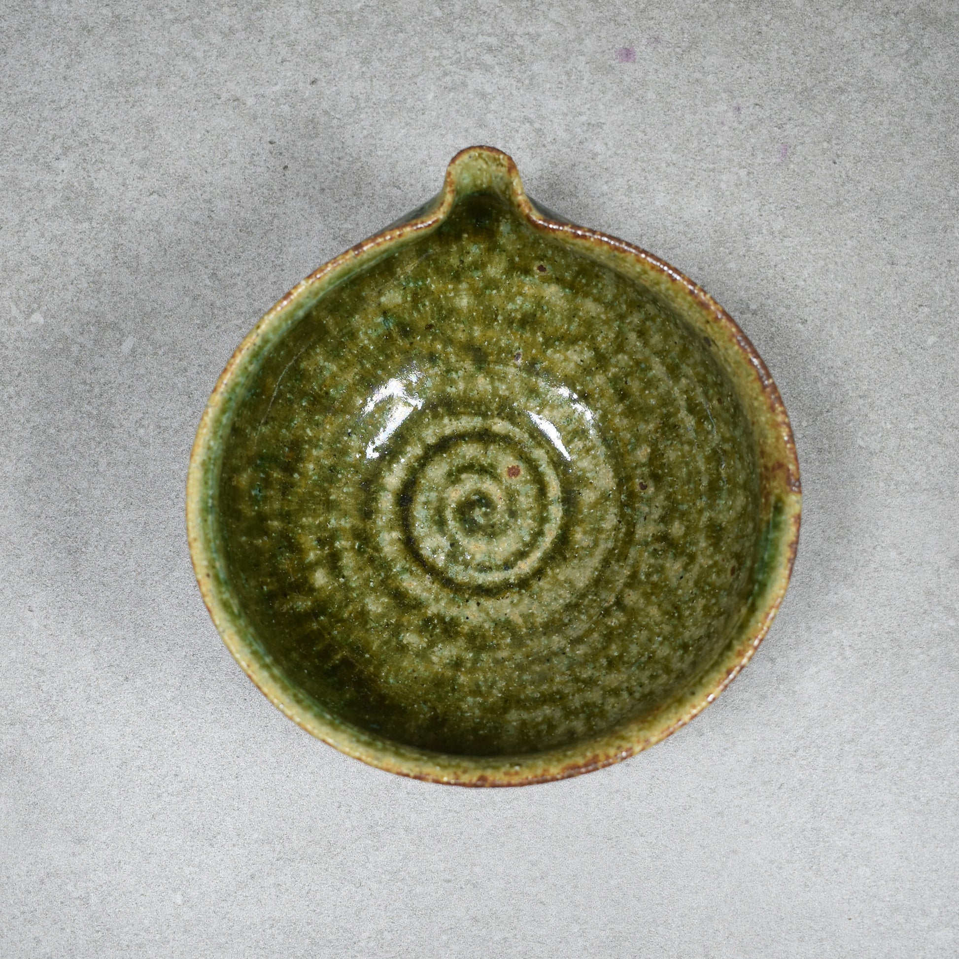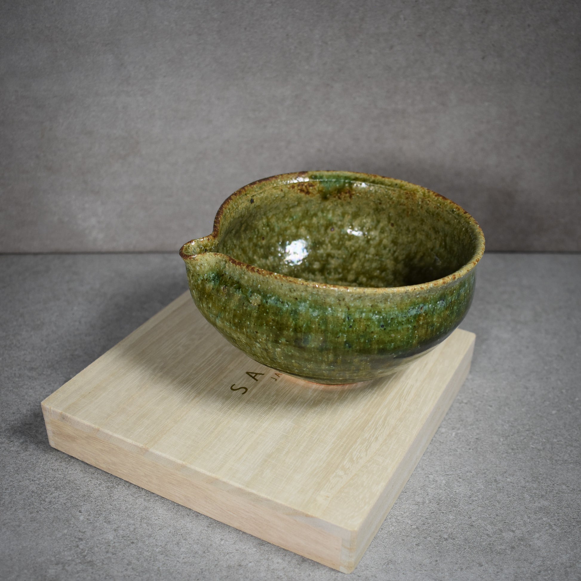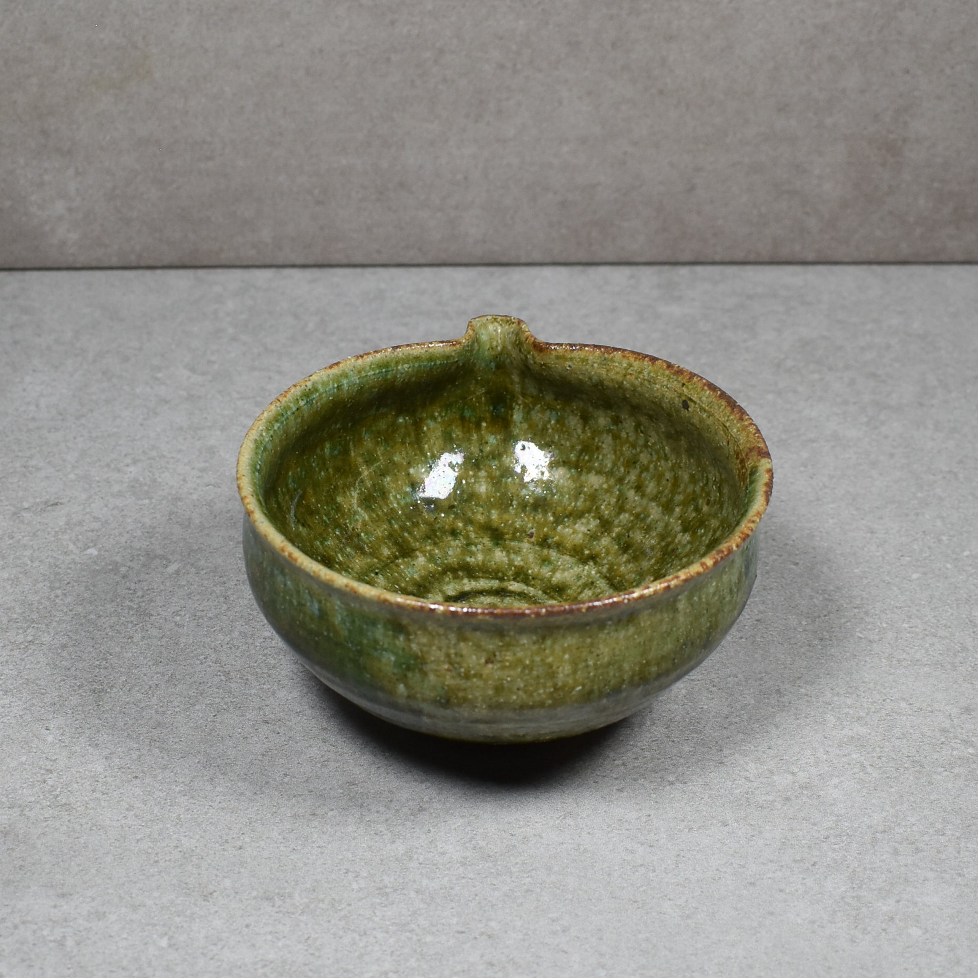 These katakuchi are made with a unique clay mix including coarse clay and iron rich clay. A glaze that changes with the kiln temperature is also used making each piece individual. The works have an enjoyable rough texture and individual characteristics such a dark spots from the iron or pinholes on the glaze surface. Some pieces may have small "cracks" knows as crazing. Some will have crazing that develops as they are used, these are part of the natural patina of the ceramic and are not a sign of damage.Â