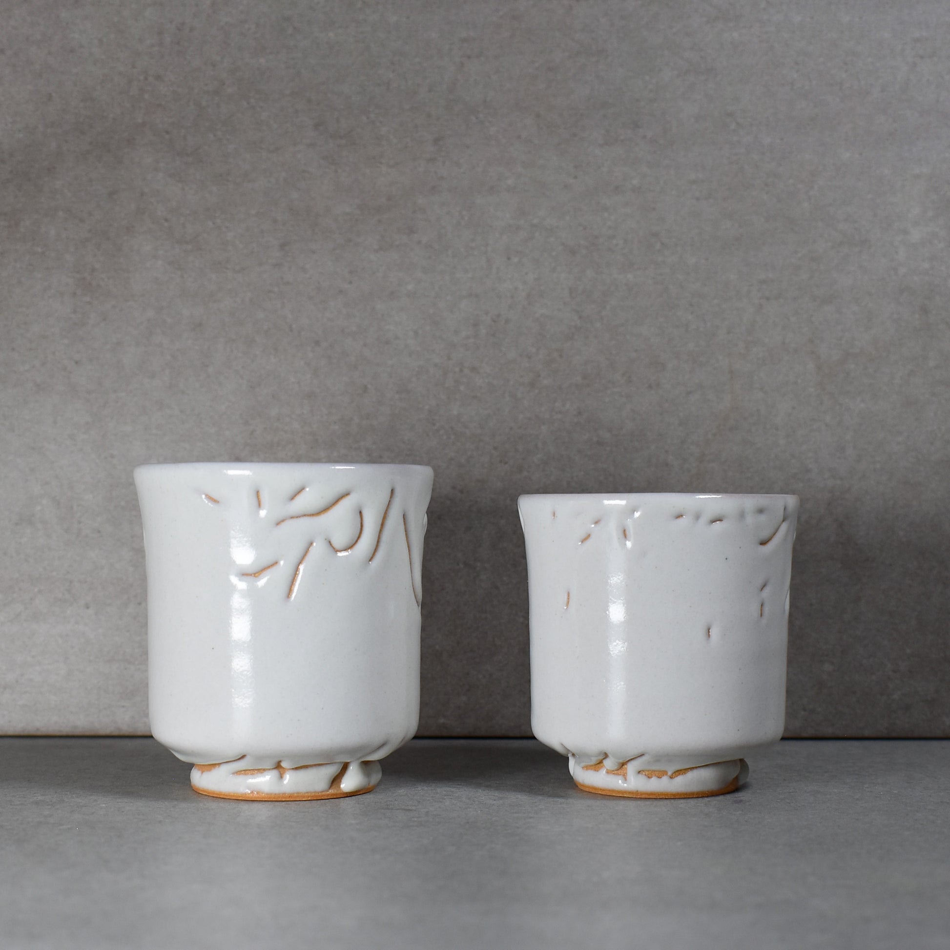A pair of hagi ware yunomi cups featuring a crackle "oni-yaki" glaze and traditional cut foot. One of the pair is slightly larger than the other. Made by the Tenryu kiln.
