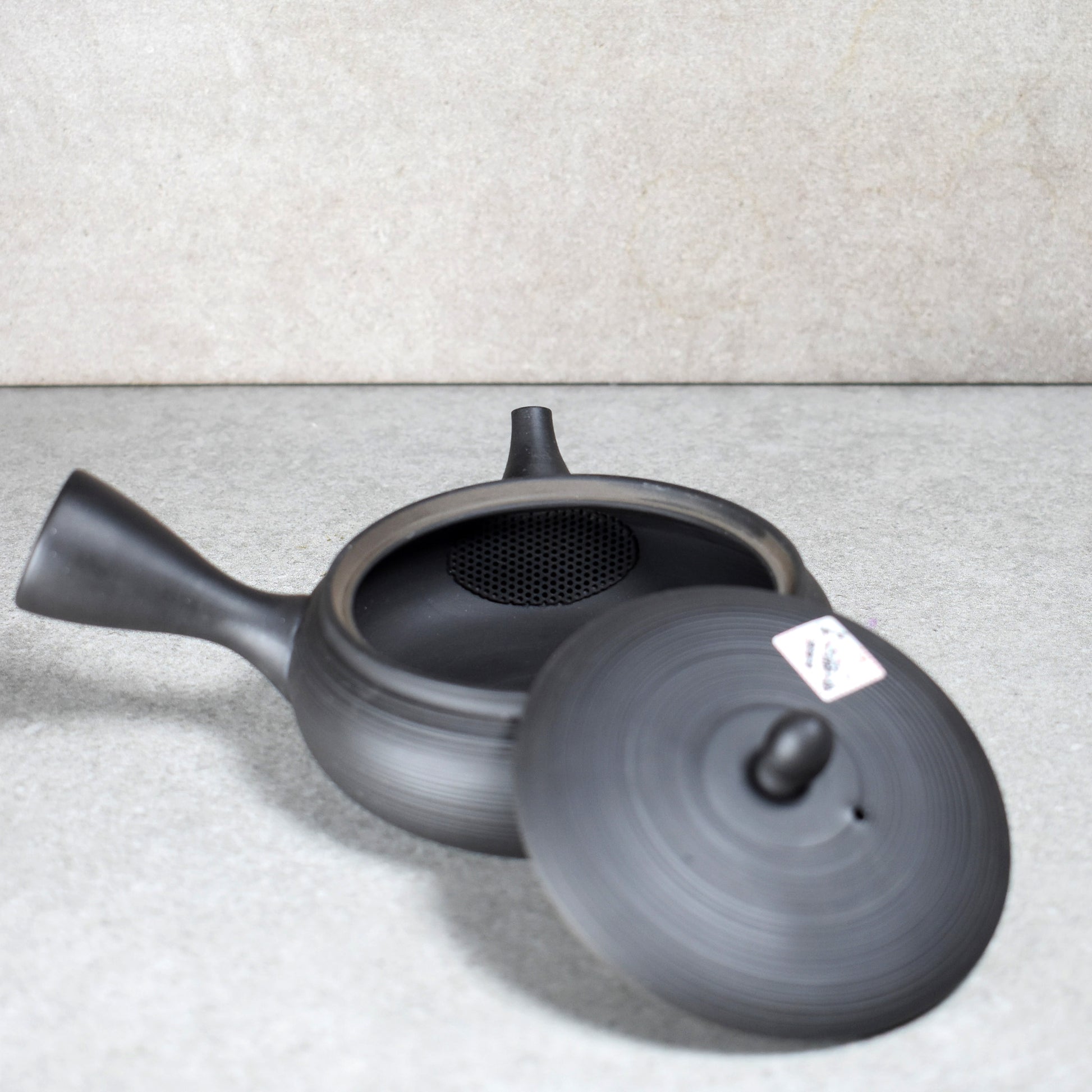 A popular flat shape kyusu with a slightly larger size making it good for one larger cup or serving tea for two people. The surface is hand finished with "1000 tiers". The fine ceramic mesh strainer is suitable for both fine and larger leaf teas.